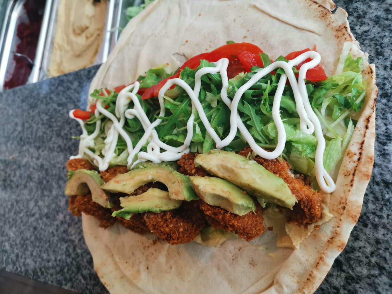 mit Falafel, Fladenbrot, Avocado, Salat, Tomaten, Hummus, Rucola und Mayonnaise